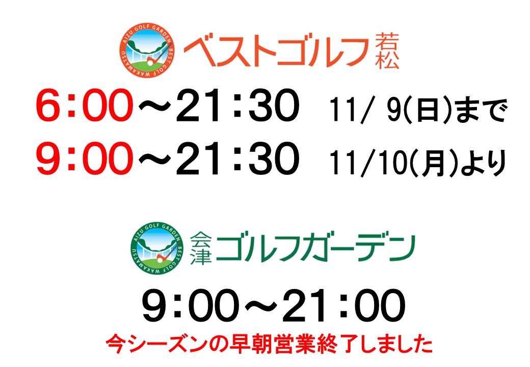 2025年11月4日 / 最終更新日 : 2025年11月4日 株式会社イリタニ お知らせ 【営業時間のお知らせ】早朝営業終了について 【営業時間のお知らせ】 ベストゴルフ若松の早朝営業は「11/9(日)」最終日になります。 会津ゴルフガーデンの今シーズン早朝営業は終了しました。