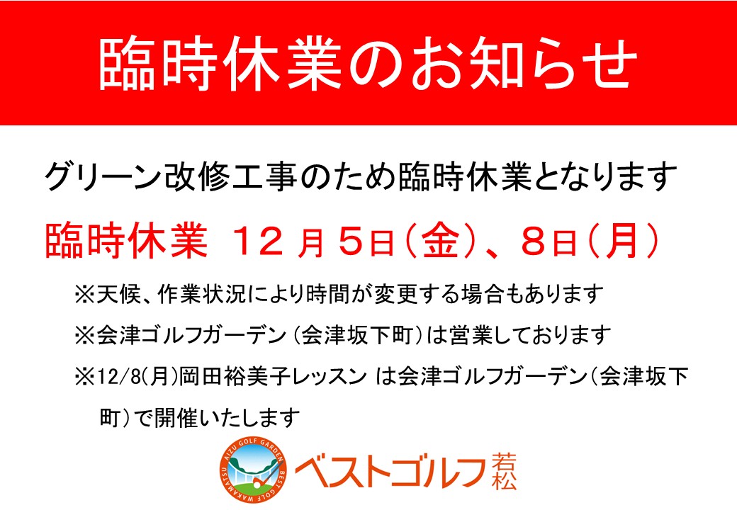 【ベストゴルフ若松】12/8(月) 臨時休業のお知らせ