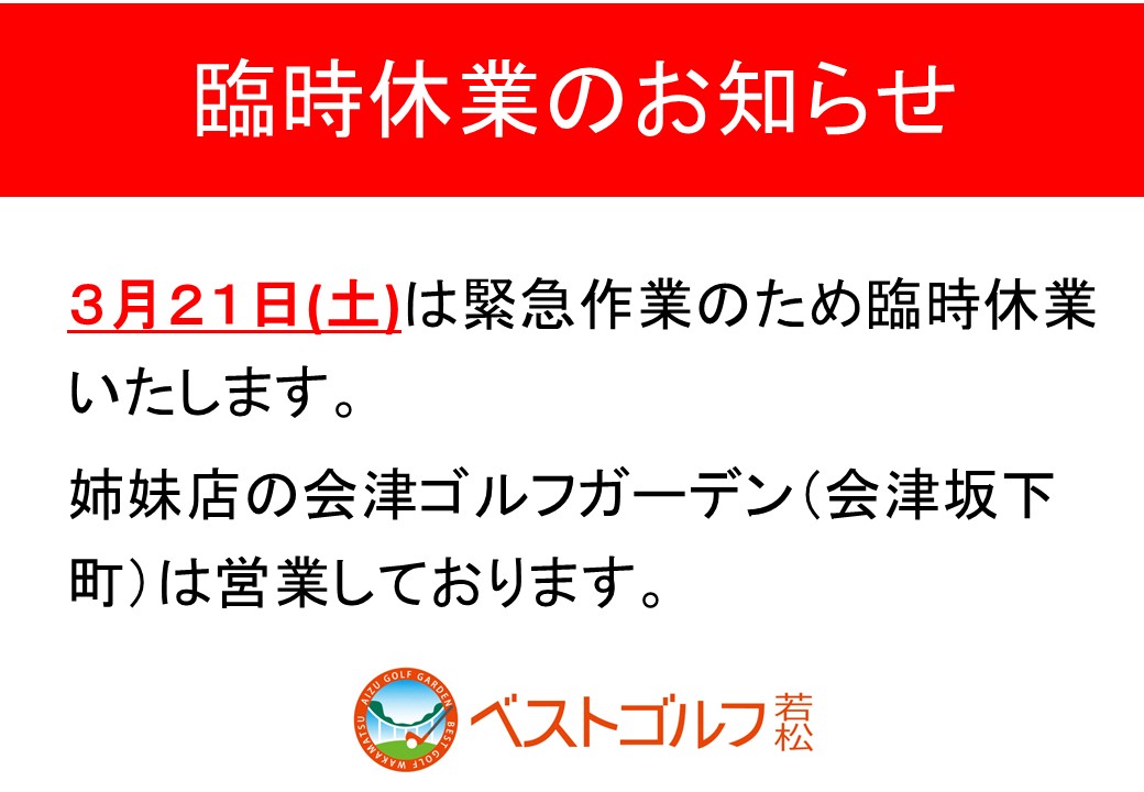 2026年3月20日 / 最終更新日 : 2026年3月21日 株式会社イリタニ お知らせ 【ベストゴルフ若松】3/21(土)臨時休業のお知らせ 【臨時休業のお知らせ】 施設緊急工事のため明日3/21(土)は臨時休業いたします。 姉妹店の会津ゴルフガーデン(会津坂下)は営業します。